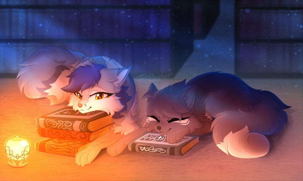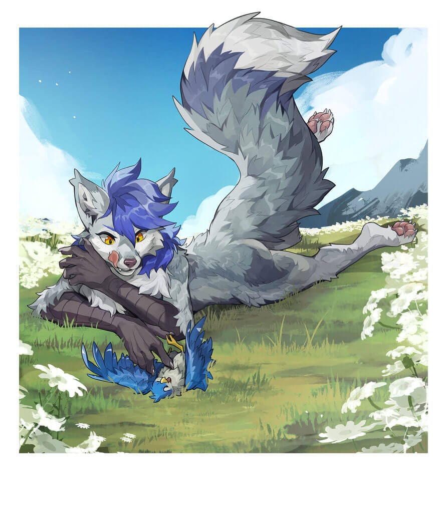 Gabby is a mythological creature called an enfield. Her appearance is more simplified than the traditional depiction of enfields and is portrayed as a fox with the forelegs of an eagle and usually drawn with wings. She is very adventurous and is oftentimes found exploring forests, mountains, overgrown ruins and caves. She has a small blue bird as her companion named North. North and Gabby are always found together no matter where they go. They both tend mess with each other, though she tends to be more physical due to her size. She enjoys being out in the rain and snow during the autumn and winter months. She likes cooking various kinds of food. She lives in a small red brick house out in the forest and can frequently be found curled up in bed. Gabby is very energetic around her friends and loves stealing pieces of apparel or clothing from others and wearing them. She also frequently likes to give playful tugs on ears and tails with her teeth.
