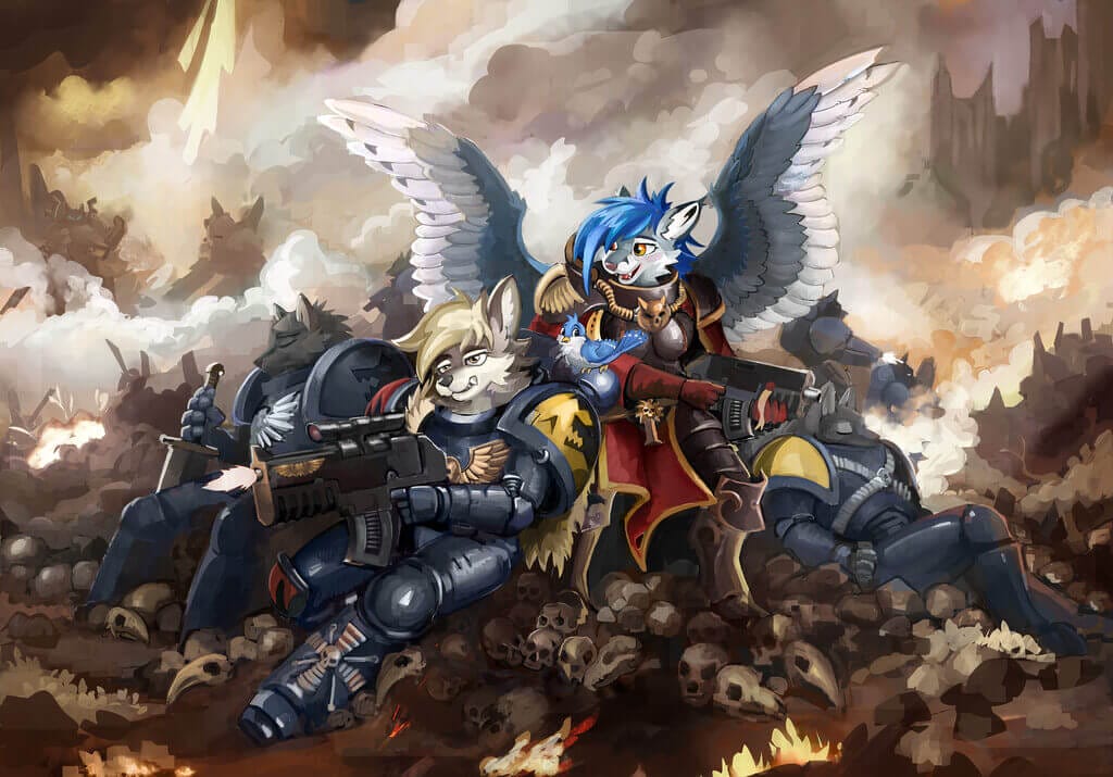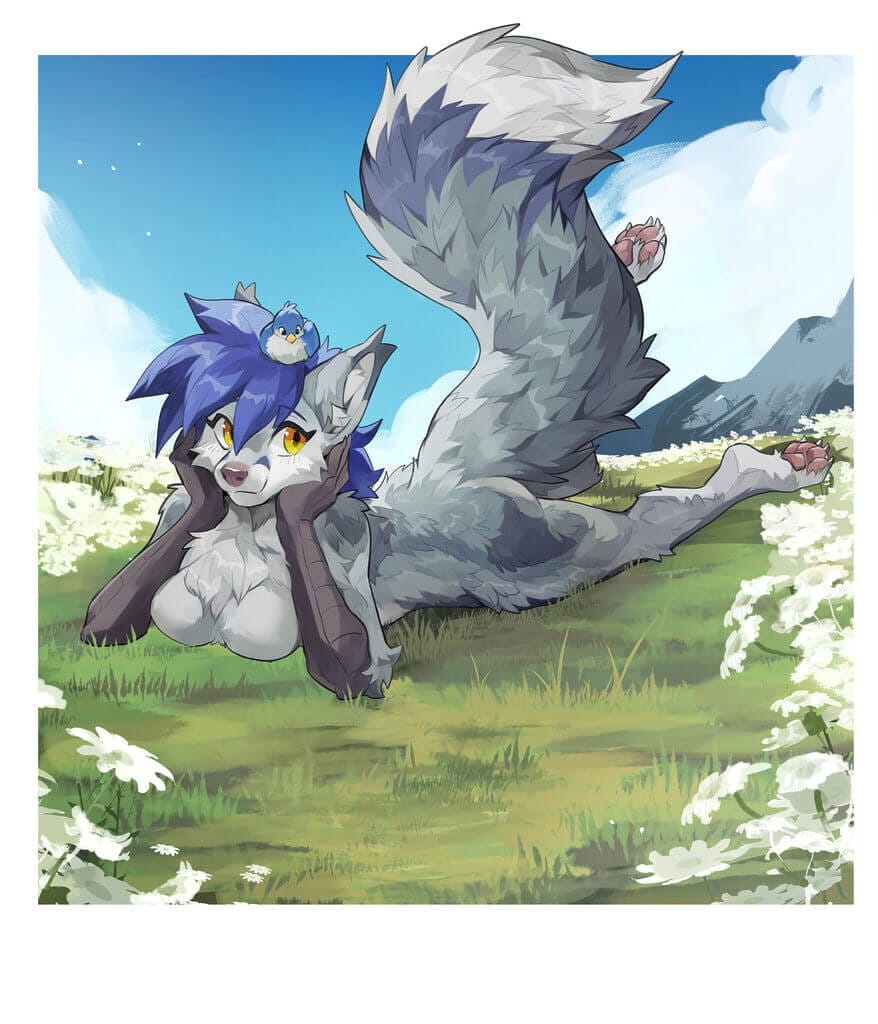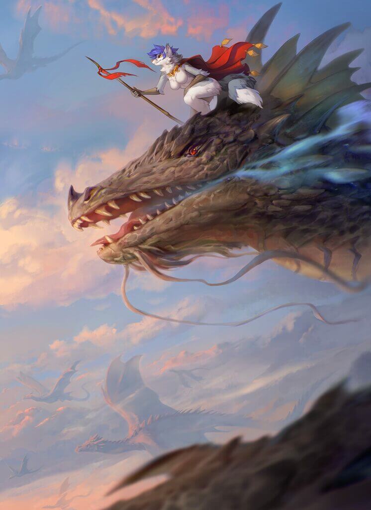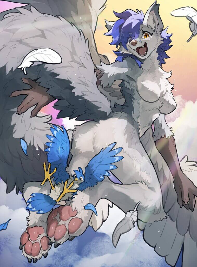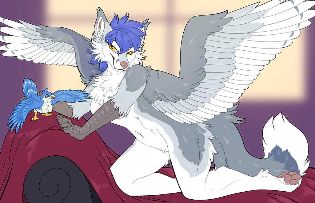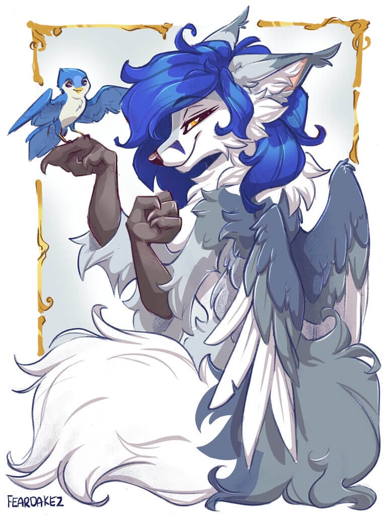 Major Characteristics: Feathered wings, scaled bird/dragon forelegs, fluffy ears, very fluffy neck, fox body, tail and hind legs